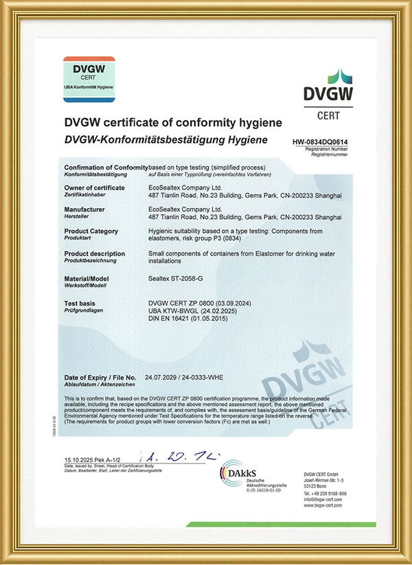我司目前供應的ST-2058-GST-2058-W滿(mǎn)足不同等級的標準要求,可為飲用水行業(yè)的客戶(hù)提供多元化的密封解決方案。KTW-BWGL認證中的P2P3等級的區別,詳見(jiàn)此前推文《SealTex索拓ST-2058-W無(wú)石棉密封材料通過(guò)KTW-BWGL飲用水認證》